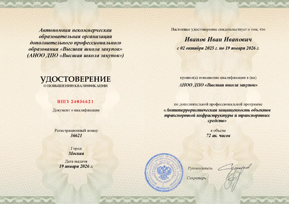 Повышение квалификации, 72 академических часов, 7 модулей: нормативно-правовые основы противодействия терроризму, анализ угроз и рисков, функциональные обязанности ответственных, инженерно-техническая укрепленность, документооборот и действия персонала при ЧС. Онлайн-обучение в в Брянске с итоговой аттестацией.