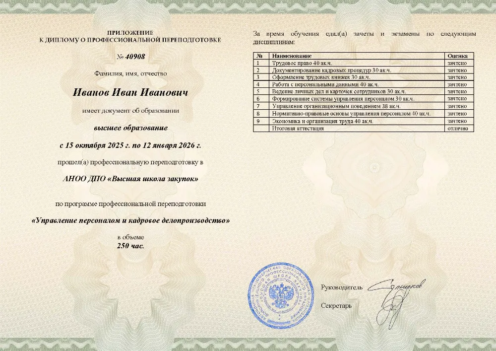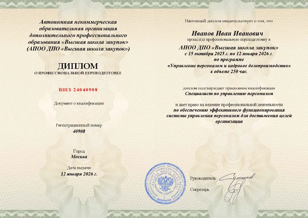 Повышение квалификации, 144 академических часа, 10 модулей: стратегическое кадровое планирование и ситуация на рынке труда, психология управления, документационное обеспечение, развитие, мотивация и вовлеченность персонала, работа с дистанционной занятостью и кадровым резервом. Онлайн-обучение в в Брянске с итоговой аттестацией.