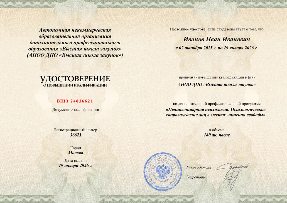 Повышение квалификации, 180 академических часов, 8 модулей: основы и структура пенитенциарной системы, социально-психологические особенности и типологии осужденных, средства исправления, работа с несовершеннолетними и деятельность психологической службы в учреждениях УИС. Онлайн-обучение в в Брянске с итоговой аттестацией.